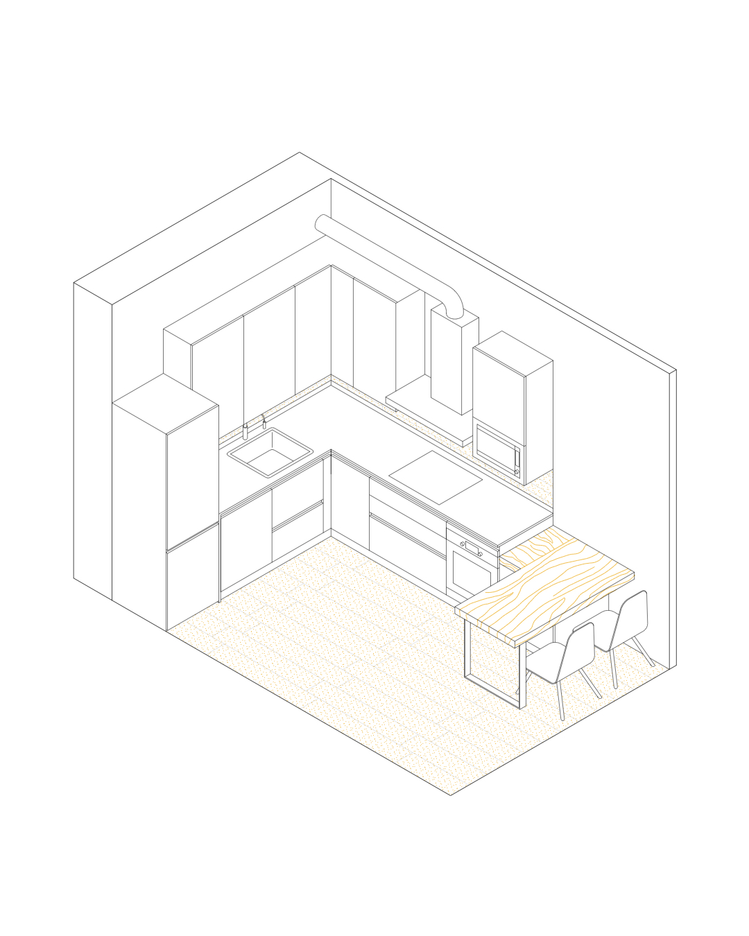 Ristrutturazione in corso di un appartamento degli anni ’50. La zona giorno è stata completamente riadeguata alle esigenze dei nuovi proprietari unendo la cucina e il soggiorno. Le finestre sono state trasformate in porte finestre per permettere una maggiore mobilità tra interno ed esterno, e per permettere a più luce di entrare. L’impianto elettrico e idraulico è stato fatto completamente nuovo. L’impianto di riscaldamento a radiatori è stato sostituito con un impianto a pavimento.